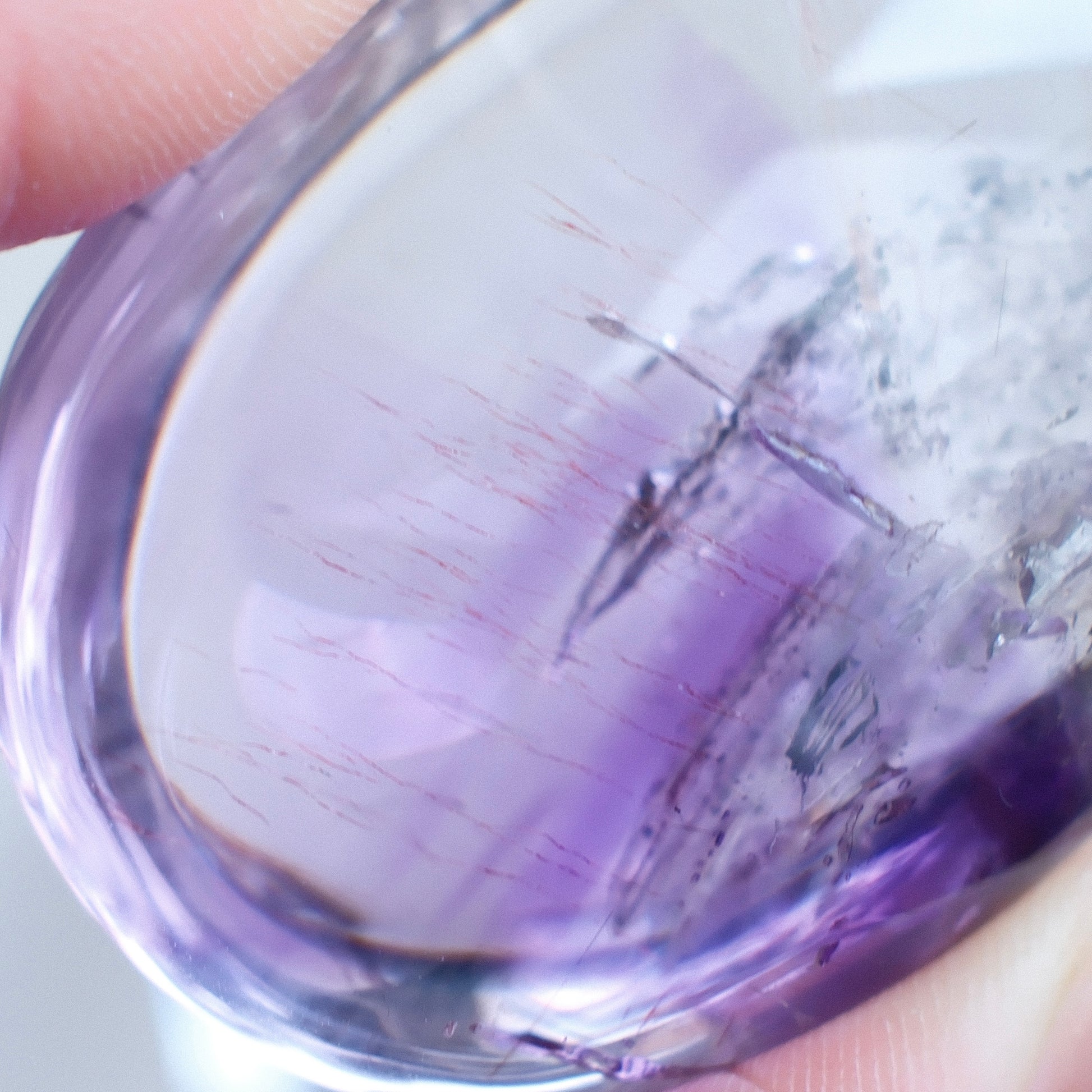 - This is a unique and mysterious amethyst palm stone with Red Super Seven inclusion, designed to look like a skeletal hand tightly gripping the crystal, full of power and presence. The amethyst is clear and rich in color, symbolizing wisdom and protection—perfect as a personal energy piece or a striking decor item.