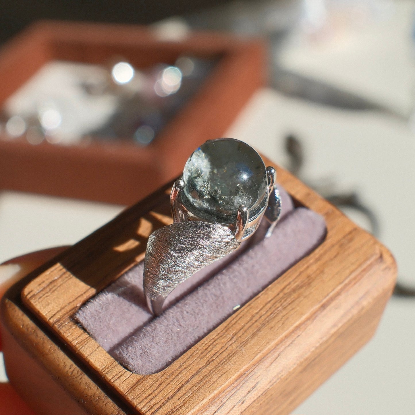 The ring holder is crafted from 925 sterling silver and features an adjustable design for wear.