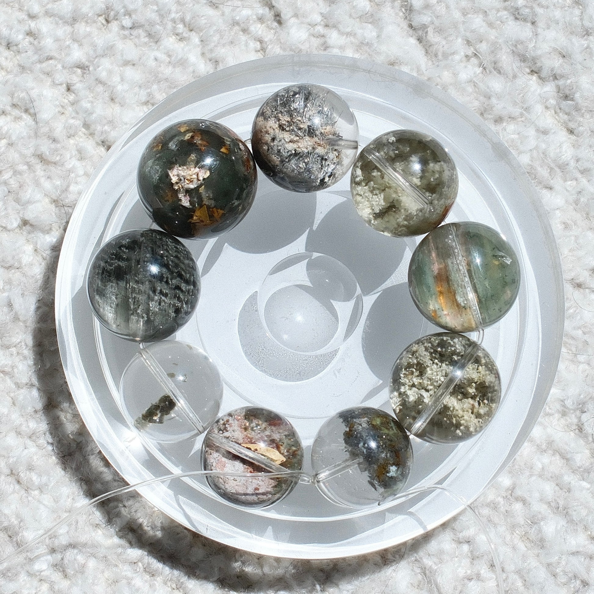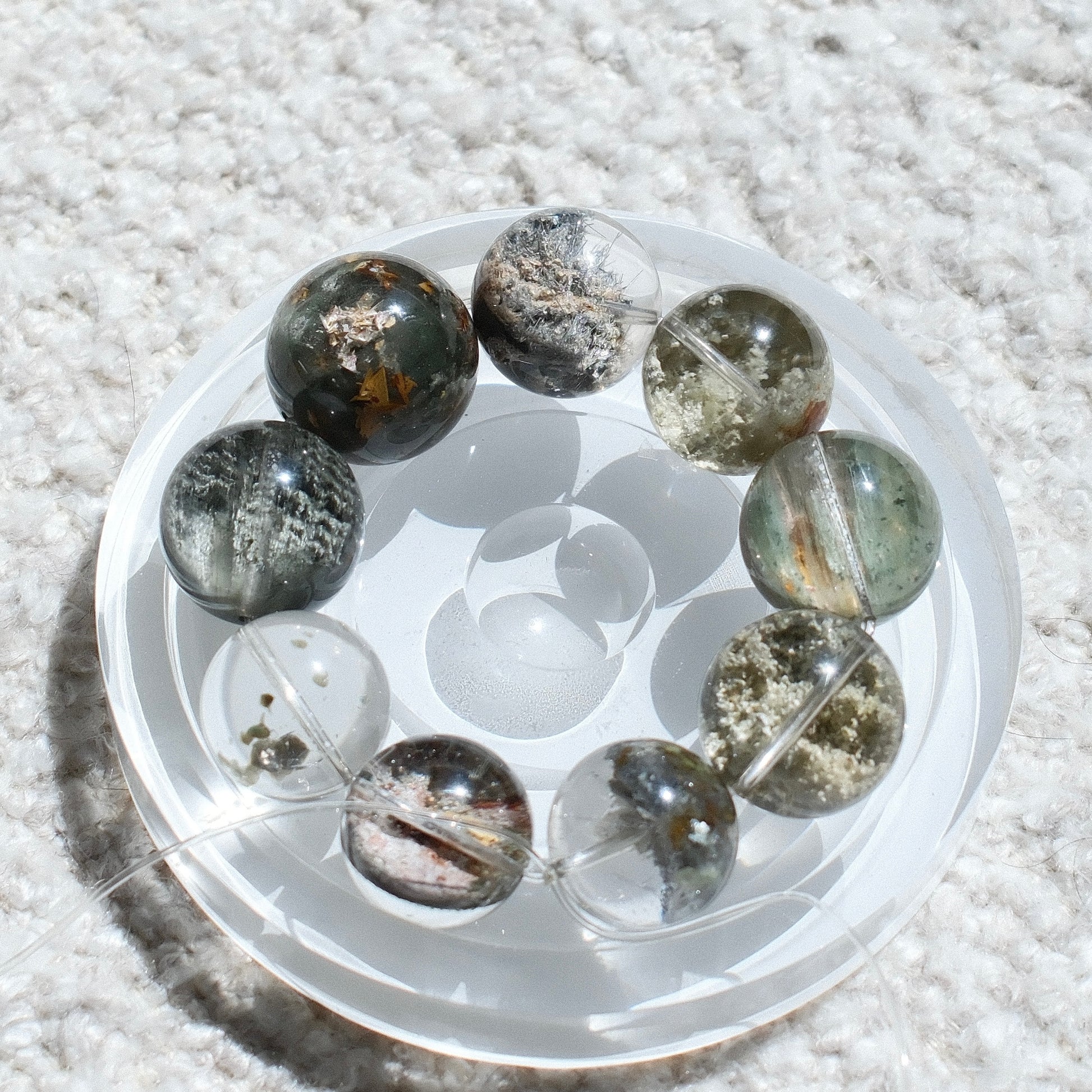 - Each bead of this Green Phantom Quartz bracelet holds a small world within. The natural green phantoms form landscapes that look like mossy hills, forests, or misty mountains sealed inside clear quartz. Every bead is different, carrying its own character and beauty, so the bracelet feels like a circle of miniature nature scenes.