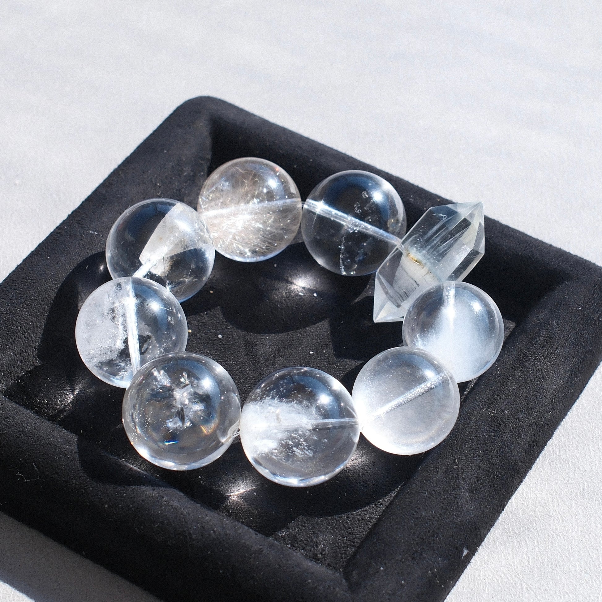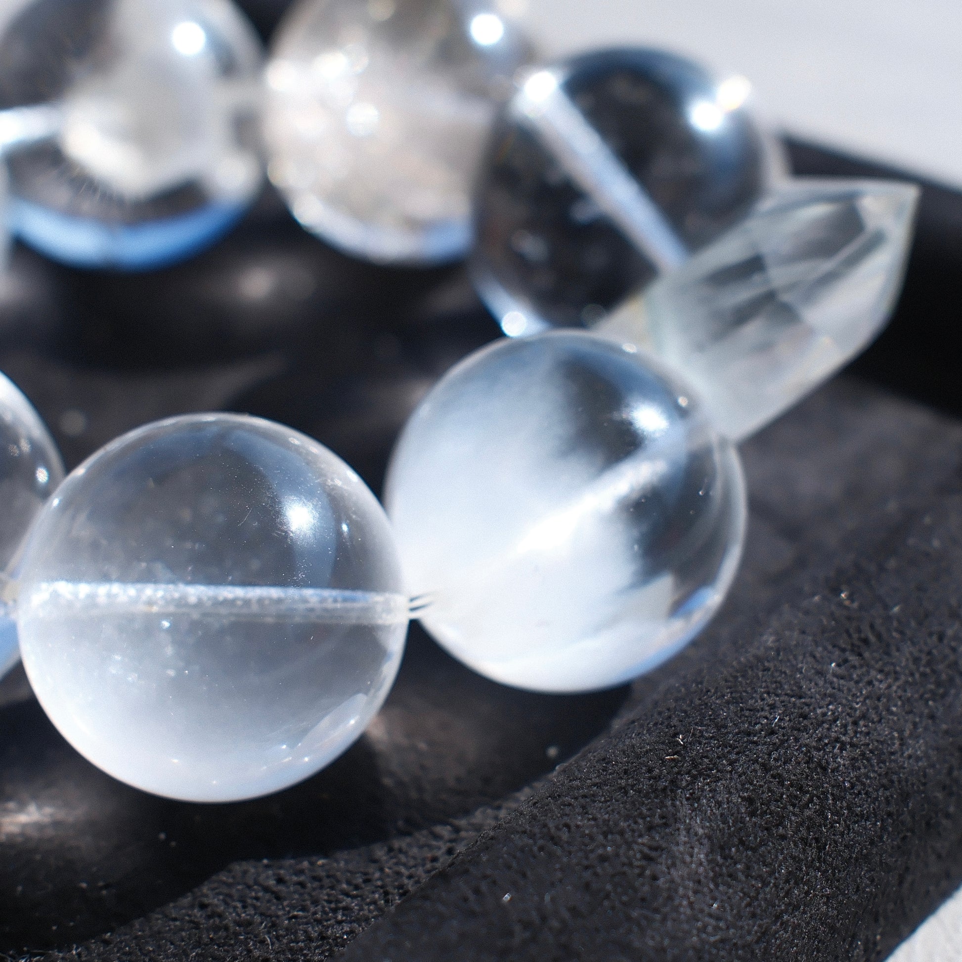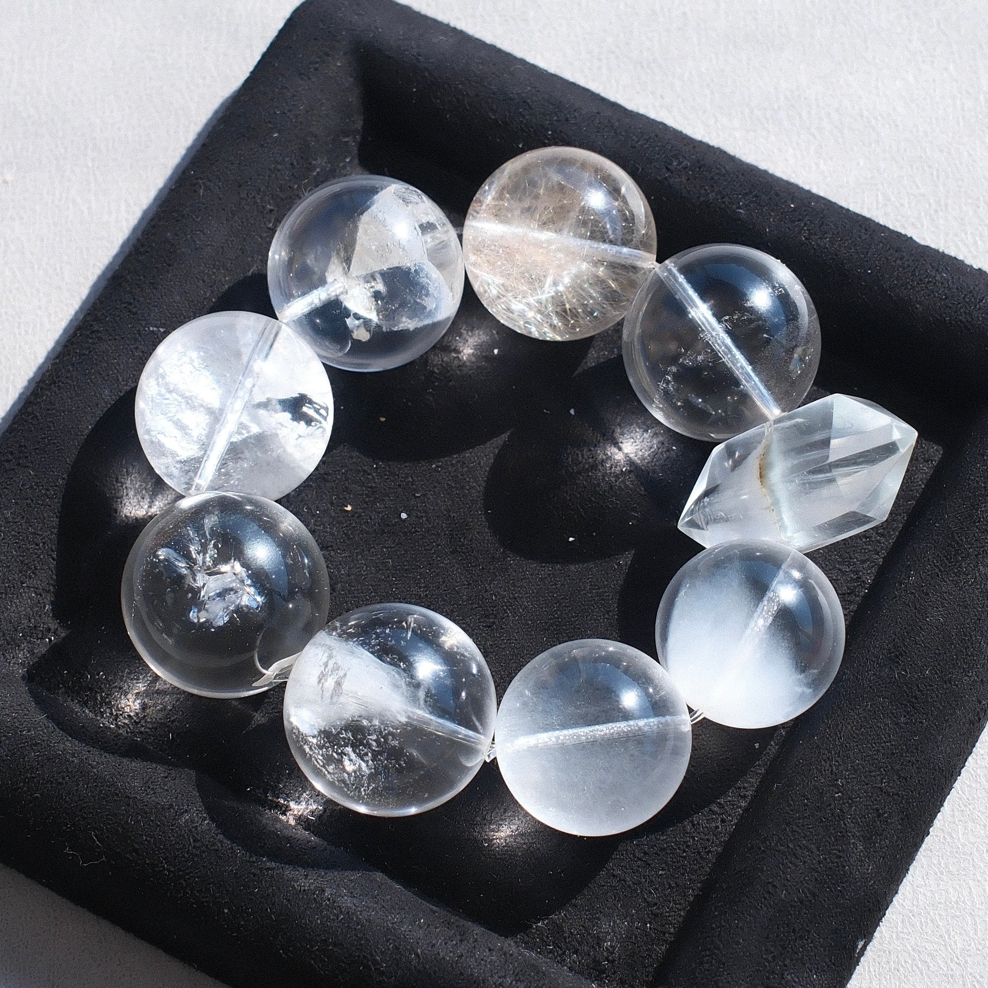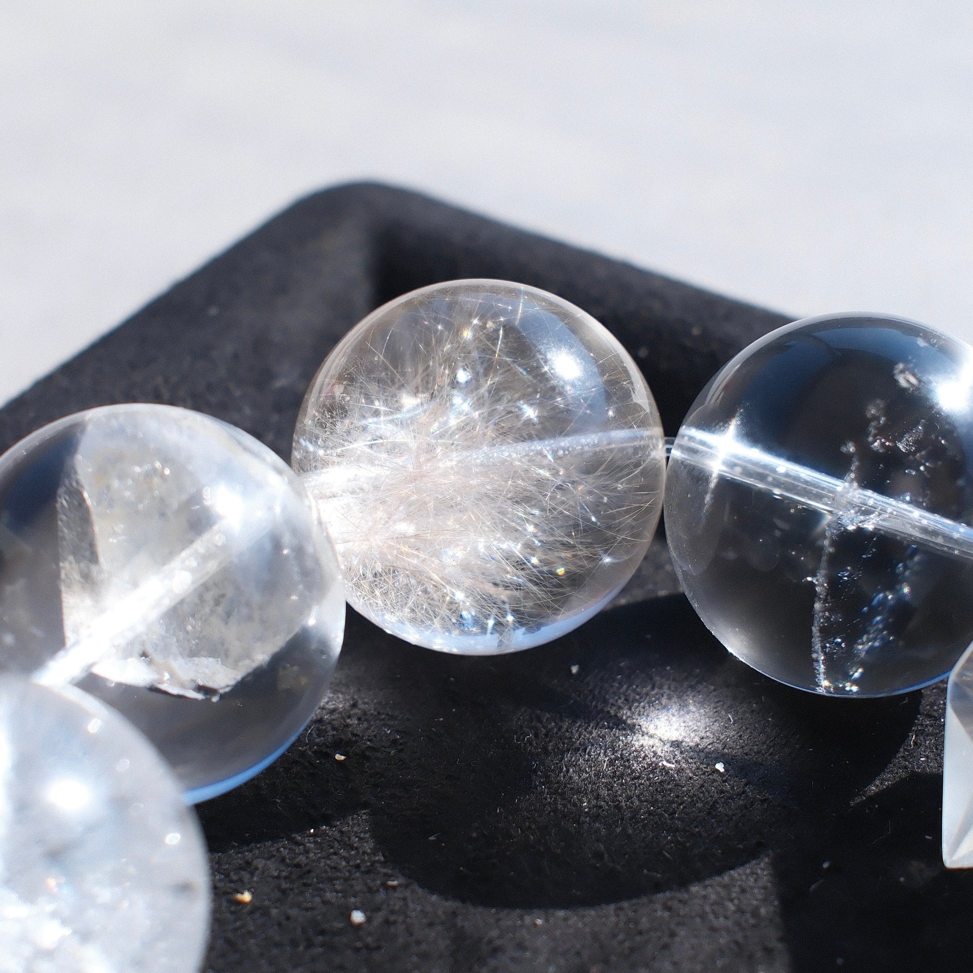 - This bracelet is made of rare crystal-in-crystal quartz and shimmering rutilated quartz, combining to create a soft and radiant “pure white” glow. Each bead reveals natural textures that resemble floating petals or drifting snow, adding a poetic and graceful charm.