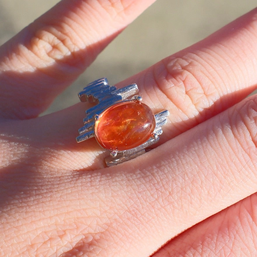 This ring contains red and yellow hematoid. It is also called Cyprinus Carpio Hematoid Quartz.