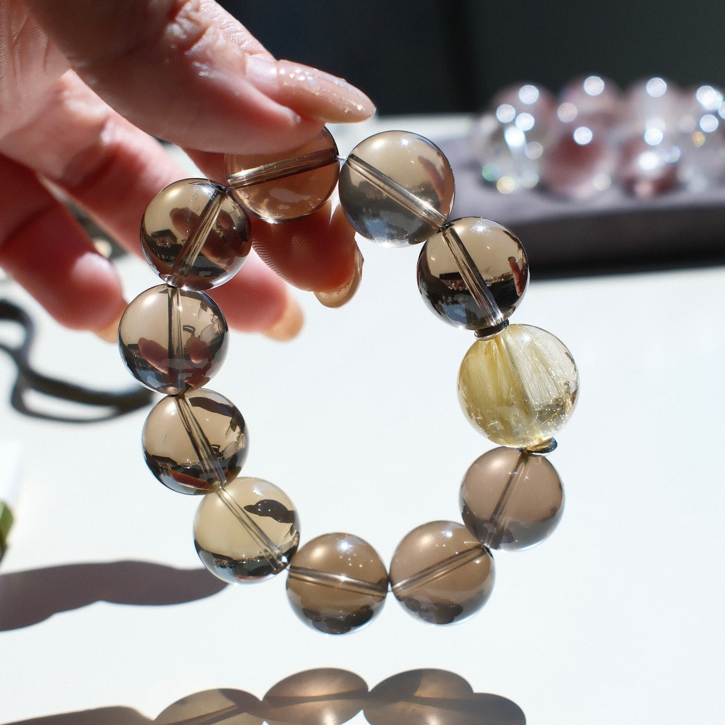 - This bracelet features high-grade smoky quartz (15.8mm) and golden rutilated quartz (17.8mm), both with exceptional clarity and brilliance. Each bead is carefully selected to highlight the natural beauty and quality of the crystals.
