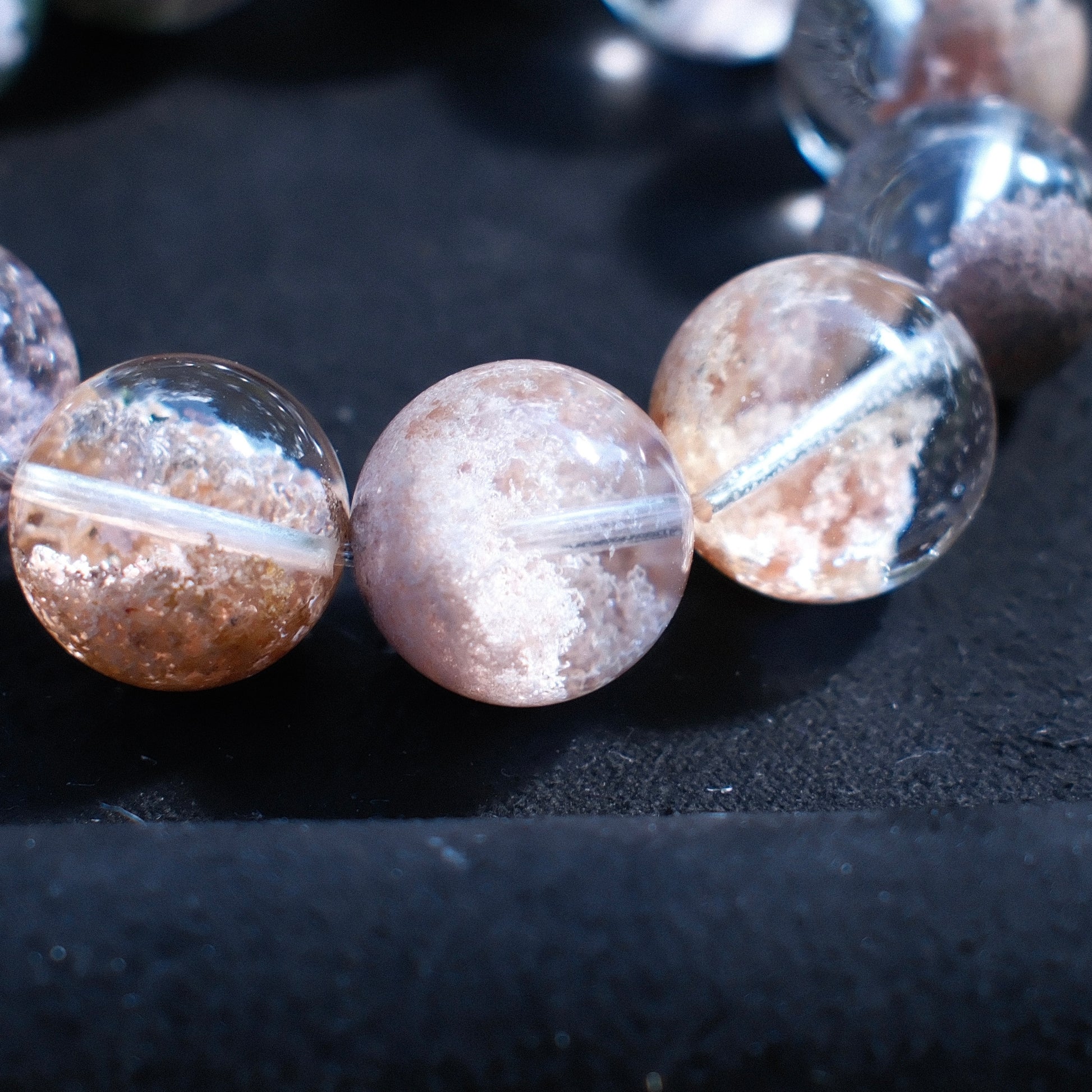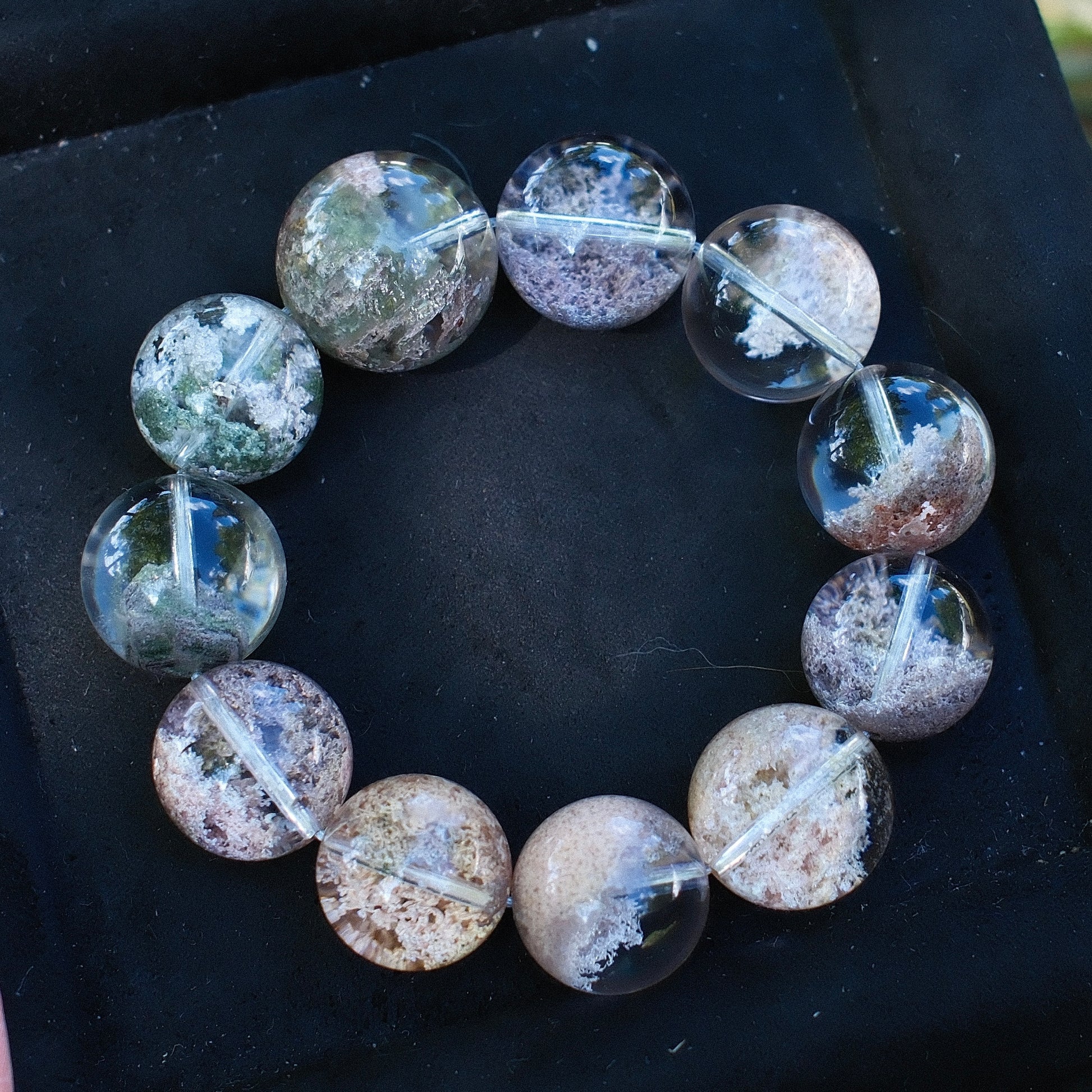 - This rare Phantom Quartz bracelet features beads with exceptional clarity and vibrant natural colors. Each sphere holds striking phantom inclusions—ranging from mossy greens and golden tones to deep reds—creating the look of miniature landscapes sealed inside clear quartz.