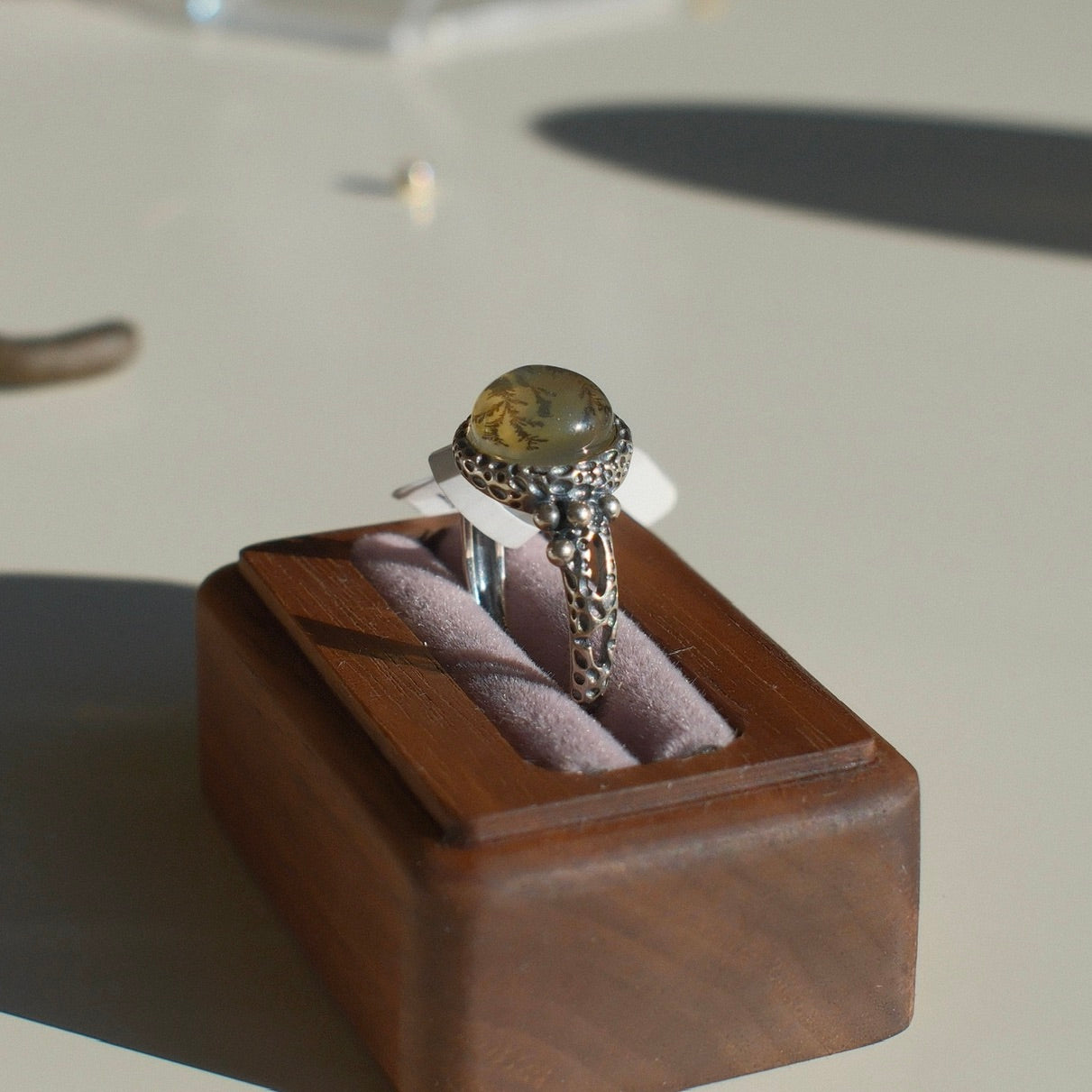 - The ring holder is crafted from 925 sterling silver and features an adjustable design for wear.