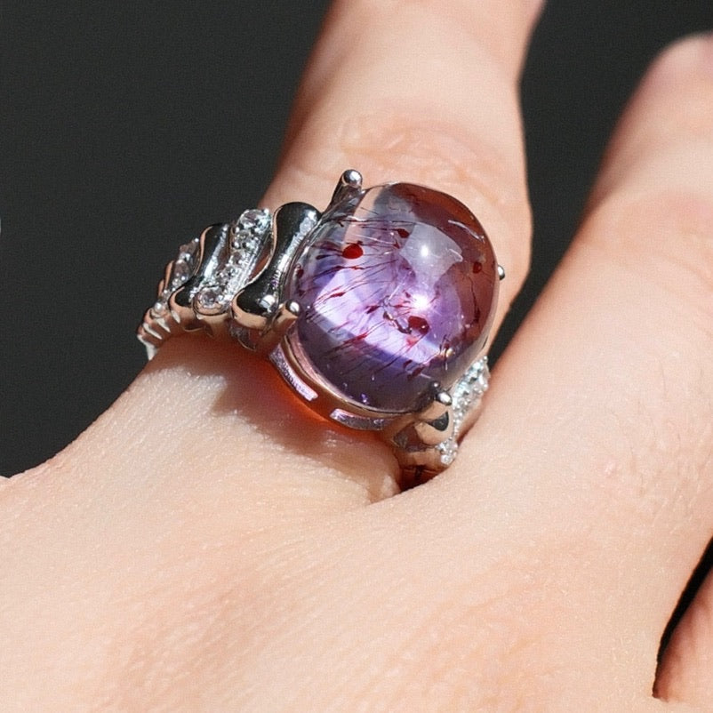 This ring features the coexistence of purple and yellow hues within a single crystal of the sacred seven.