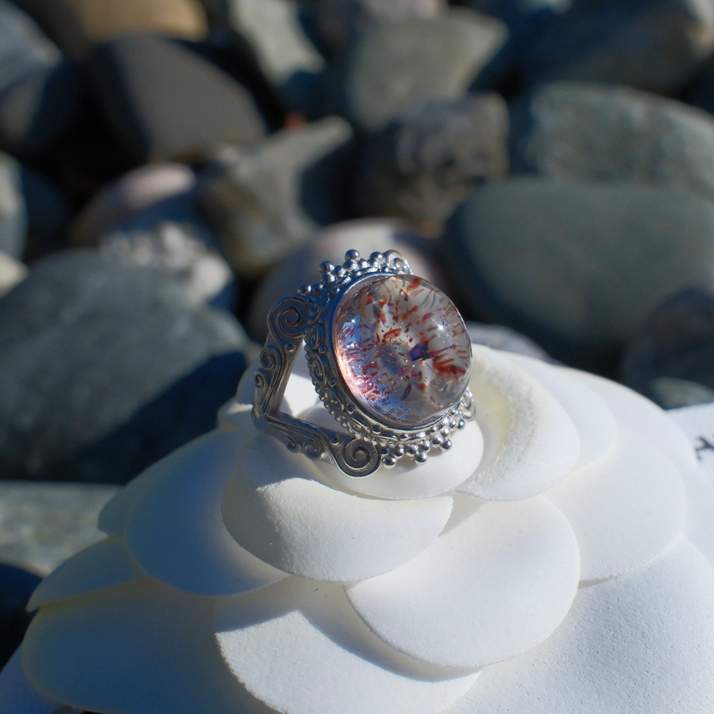 This ring features the coexistence of red and gold hues within a single crystal of the sacred seven.