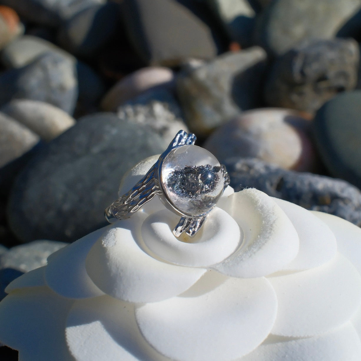 This ring features vivianite, a rare crystal containing blue mineral inclusions. Vivianite is also widely utilized in spiritual healing practices for its therapeutic properties.